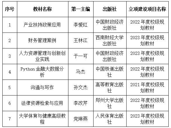 按照《河南省高等学校教材管理实施细则(试行)》《河南财政金融学院自编教材建设办法(修订)》等文件要求,学校教材建设委员会对申请结项的校级规划自编教材建设项目进行了评审,《产业扶持政策应用》等7部教材在内容、体例、先进性和适用性等方面符合结项条件,现准予结项,现将结果公示如下。