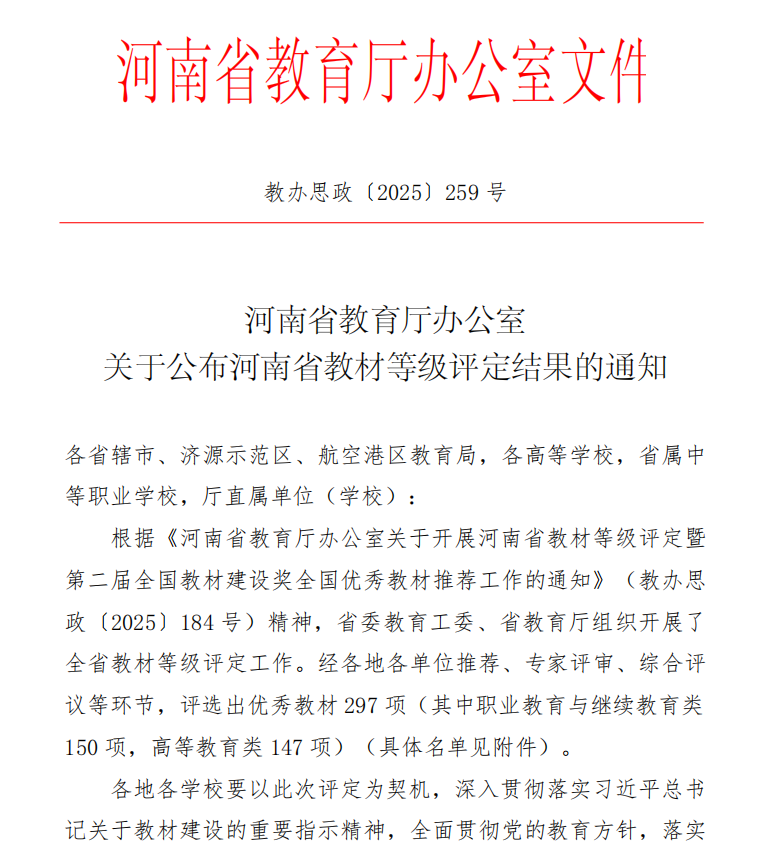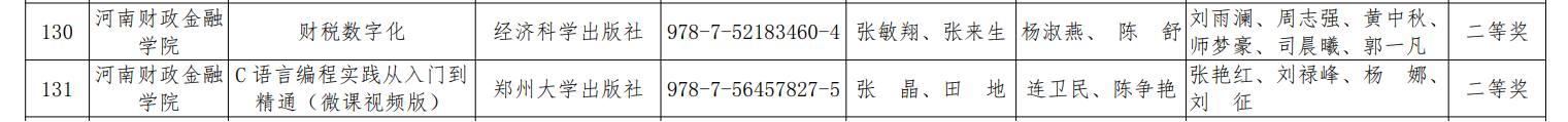 近日,河南省教育厅发布了《关于公布河南省教材等级评定结果的通知》(教办思政〔2025〕259号),我校《财税数字化》《C语言编程实践从入门到精通(微课视频版)》2部教材荣获河南省教材等级评定二等奖。